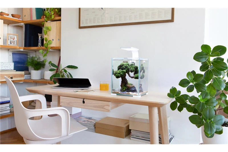 Die einzigartige Leddy Smart LED-Lampe besitzt eine moderne, flache Form und verbraucht nur geringe 4,8 Watt Strom. Die Beleuchtung betont die natürliche Färbung von Garnelen und Fischen, zudem kann mit dieser energiesparenden Leuchte ein natürlicher Tagesablauf simuliert werden durch 3 verschiedene Beleuchtungsmodi (Tag, Nacht, Dämmerung). Die in den vorherigen Versionen verwendeten Schaumstoffunterlagen wurden durch minimalistische Kunststoffecken ersetzt die unter dem Aquarienboden angebracht sind und ein ausgeklügeltes Aufhängungssystem für die Abdeckscheibe wurde neu entwickelt. Die Sauberkeit des Wassers stellt der mitgelieferte Turbo Mini Filter sicher, dieser leistet einen Durchfluss von ca. 320l/h bei fast geräuschlosem Betrieb.