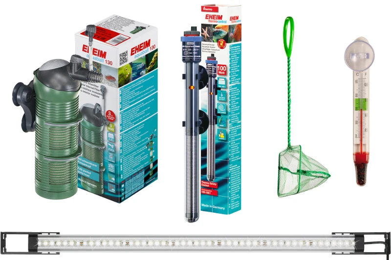 - Komplett-Set inklusive hochwertiger Ausstattung: EHEIM Innenfilter aquaball; EHEIM Reglerheizer; Thermometer; Fischnetz