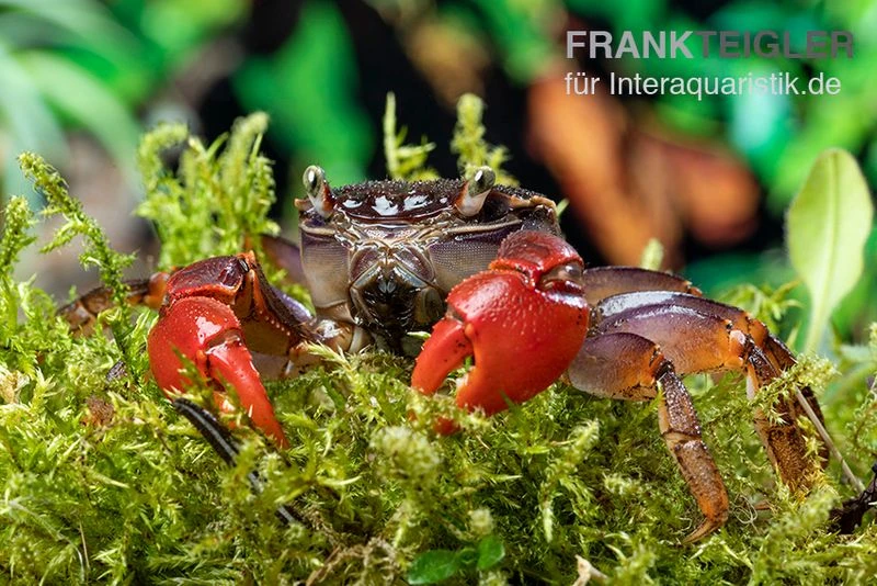Neosarmatium cf. meinerti sind wunderschön anzusehen und attraktiv zu beobachten. Mit ihrer attraktiven Färbung sorgen die Süßwasserkrabben für die nötigen Farbtupfer im Becken. Für die artgerechte Haltung und Pflege von Spider Crab sp. Extreme Red empfiehlt sich ein Aquaterrarium mit einer Kantenlänge von ungefähr 80 cm. Der Wasseranteil sollte dabei 70 % betragen. Am integrierten Landteil sollte zum Wohle der Tiere eine Luftfeuchtigkeit zwischen 24 und 30 Grad Celsius vorherrschend sein.